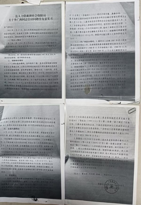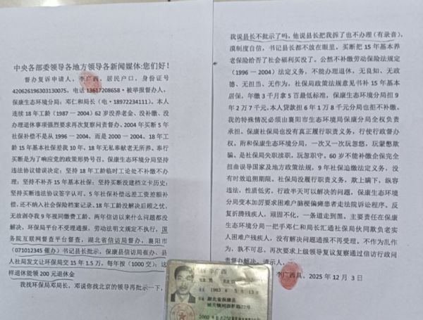 从李广西2025年12月3日投诉材料显示,因他有书法盆景雕刻的特长,1987年,因特长,在环保局姜领导的关心下,派人从沙市(李某打工的地方)接回保康,进入保康县原腊梅管理处工作,直至2004年单位改制,被以“买断工龄”的方式解除劳动关系。始终未能建立完整的企业职工养老保险账户。3前年因病伤失劳动能力以来,多次通过信访、复议等方式申请解决养老问题,却始终被卡在两个理由上:一是其身份被认定为“临时工”,二是当年签署过“买断协议”,视为权利已一次性处理完毕。临时工不存在买断,买断了又说李某是临时工,自相矛盾。明显违背劳动法。工作前的18年怎么买断。其目的是为了逃避应交保险的法定义务。短期亏了国家,长期结果是受害了李某。