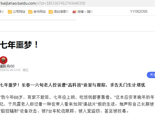 她说:七年来,12337发过微信,因为在北京打黑除恶发过信息,但因手机被监听监控,查不到。12389往北京打不通,电话被黑社会监听监控,往北京发的材料,她给都追回,发不过去。我现在的住所,楼上给我按的是脑控器,我在家里专门控我,这台机器能看到我做啥,说话带回音她能听到,楼下给我按的振楼器,24小时床是振动的,站在地上是扎脚的,床上24小时是扎人的带电的,每天在床上睡觉的时候,让她电的头部痉挛,每天电的全身像电扎一样,浑身疼痛,无处藏躲,现在电的甲状腺疼痛,腰疼站不起来,胳膊抬不起来,我门口扎的十字花型,做饭漏煤气,十分危险,她又买通扫楼道的人,电表箱子总是开着的,往屋里放辐射,干活的3点钟敲门,叫我们不能休息,我家门口二十四小时有人听声,往室内放辐射,我东边是个空房子,晚上安辐射器,往屋里放辐射,南边有车辐射,西边有车往屋放辐射,四边攻击我,已经侵犯我人身权力,我是一个68岁老人,多次投诉无果,我一上楼电梯保证往上走,我一下楼电梯也是往上走,下来时电梯是空的,我和我儿子的身份证信息都被人盗走,我这都有录时和照片,最可恨的是用万能钥匙入门盗窃,给老人拍迷魂药,上面有2位老人,一个77岁,一个72岁的,72岁老人遭受脑控以后,已经脑部出血,刚从ICU抢救回来,在家里还有人周人放。因为这个穿墙波辐射,对人伤害最大,时间长人会得白血病,最可恨的是于凤霞住院,住旅店,上亲属家,他都不放过,跟踪定位骚扰,他已经侵犯我人身的权力,包括我到昆明丽江,宁波,他都不放过,买通我快递盗取了丽江的电话号码,我到这几个地方也得备受骚扰,烧烟呛我,砸房子,在安德他买通寺庙主持,也是砸房子,在那呆不下去,回长春之后又去宁波,飞机起飞的时候,手机关机。飞机降落的时候飞机开机,我已经被大数据定位,到住所之后,上午好,下午床开始是振动的,也是砸房子,给我饭里投毒,装沙子,中药被换,使我无法正常生活,已经侵犯我人身权力。如果我和我四人亲人有什么事,后果他付完全责任。